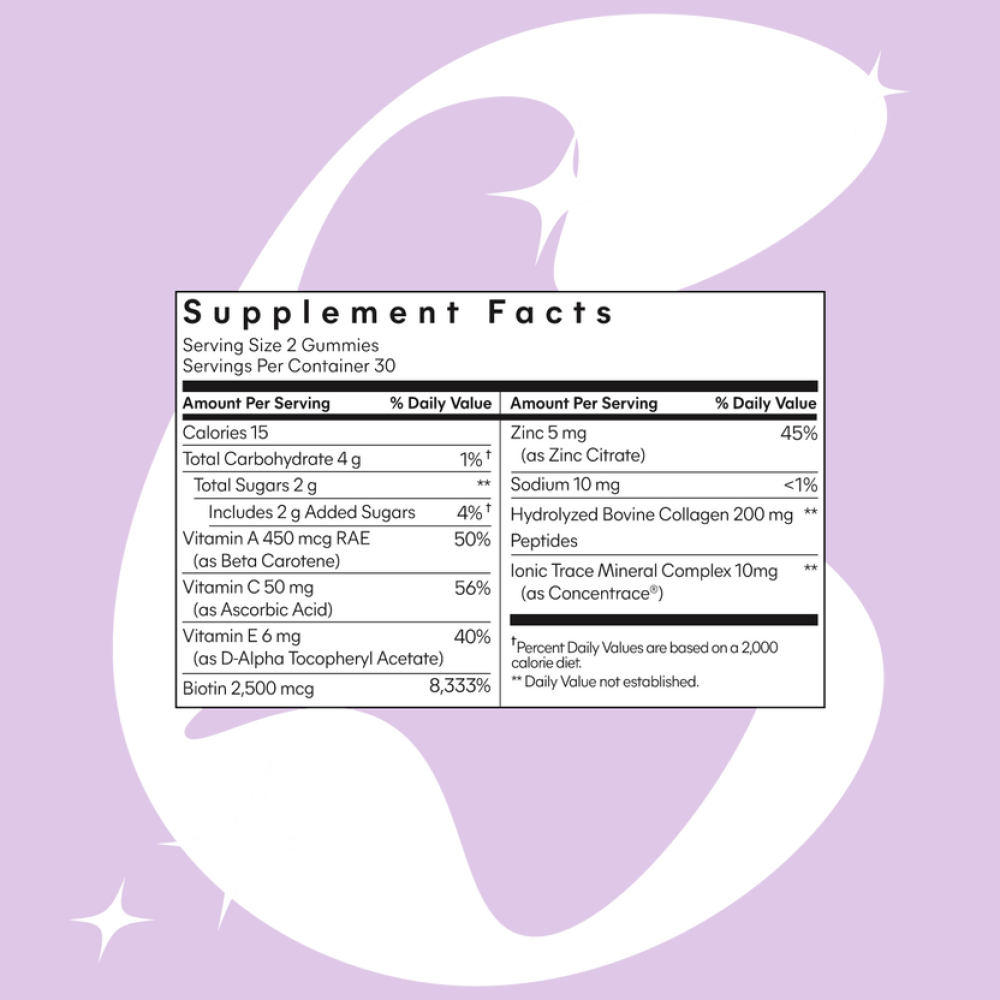 تركيبة تجميل مثالية البيوتين والزنك يدعمان صحة الشعر والبشرة والأظافر بينما يمنحك مزيج فريد من ببتيدات الكولاجين وفيتامينات أ، ج، هـ، والمعادن الأيونية النزرة تألقًا من الداخل والخارج يدعم صحة الشعر يعزز نضارة البشرة يدعم قوة الأظافر تركيبة برو-ريتينول إنتاج الكولاجين