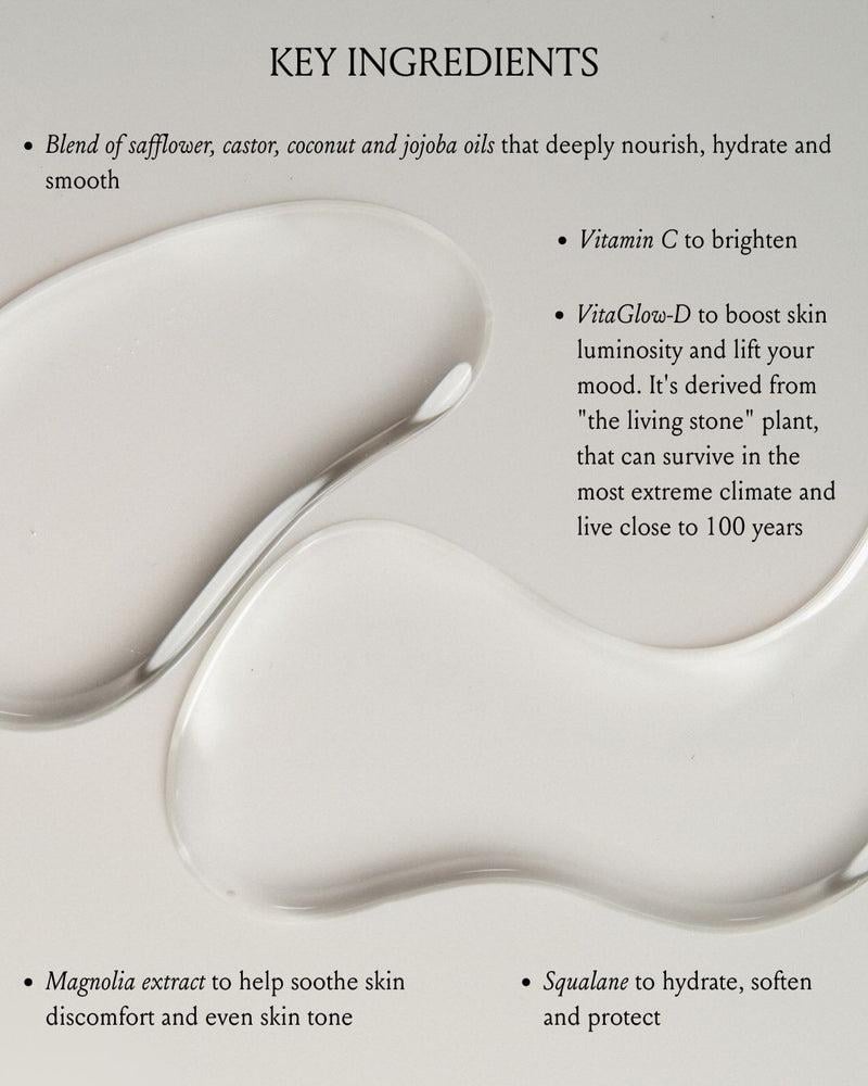 زيت الجسم سريع الجفاف والغني بمضادات الأكسدة الذي يرطب ويضيء ويقلل من بلات البشرة للحصول على توهج نشط مضاد للحساسية غير مزعج تم اختباره سريريا وطبيب الأمراض الجلدية مناسب للسفر الصيفي يحمي من الضغوطات البيئية ويدعم مزاجا متوازنا ومرتفعا يضيء البشرة، يرطب وينعم للحصول على مظهر جديد ومتجدد يوفر عطرا زهريا طويل الأمد ومنشطا زيت برونيل الصحوة هو مزيج ناعم حريري غير مزعج من زيوت القرطم والخروع وجوز الهند والجوجوبا، مما يترك بشرة ناعمة ومتوهجة ترفع الحواس. تشمل المكونات النشطة الرئيسية السكوالين وفيتامين ج ومستخلص ماغنوليا وفيتا جلو د. يحتوي زيت الصحوة برونيل على رائحة زهرية نشطة وخفيفة تفتح مع روائح ماغنوليا رشيقة وخشب جوز الهند الكريمي والعنبر الدافئ مضاد للحساسيه غير مهيج. تمت صياغته مع وضع البشرة الحساسة في الاعتبار ولن يسد المسام نباتي وخالي من القسوة لا يوجد كبريتات أو بارابين أو فثالات غني بمضادات الأكسدة
